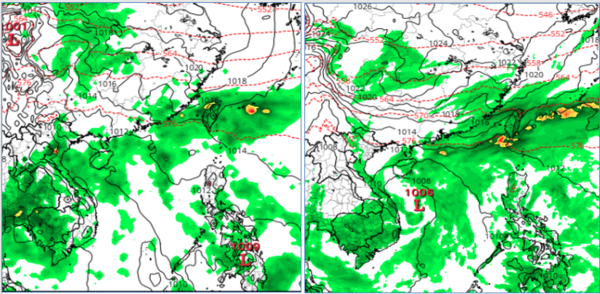 ▲17日20時歐洲模式(ECMWF左圖)及美國模式(GFS右圖),模擬23日20時地面圖皆顯示,鋒面南下併南方水氣,降雨範圍大。(圖/「三立準氣象·老大洩天機」擷自tropical tidbits)