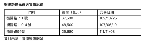 衡陽路71號2013年實價揭露6.75億元,衡陽路104號2